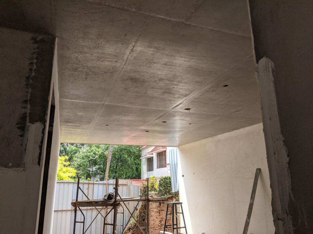 Exposed ceilings are casted in such a manner so as to provide less joints by incorporating larger shuttering panels at the time of concete slab placement. This is done in order to achieve fewer joints in the ceilings and then polished to a matte finish